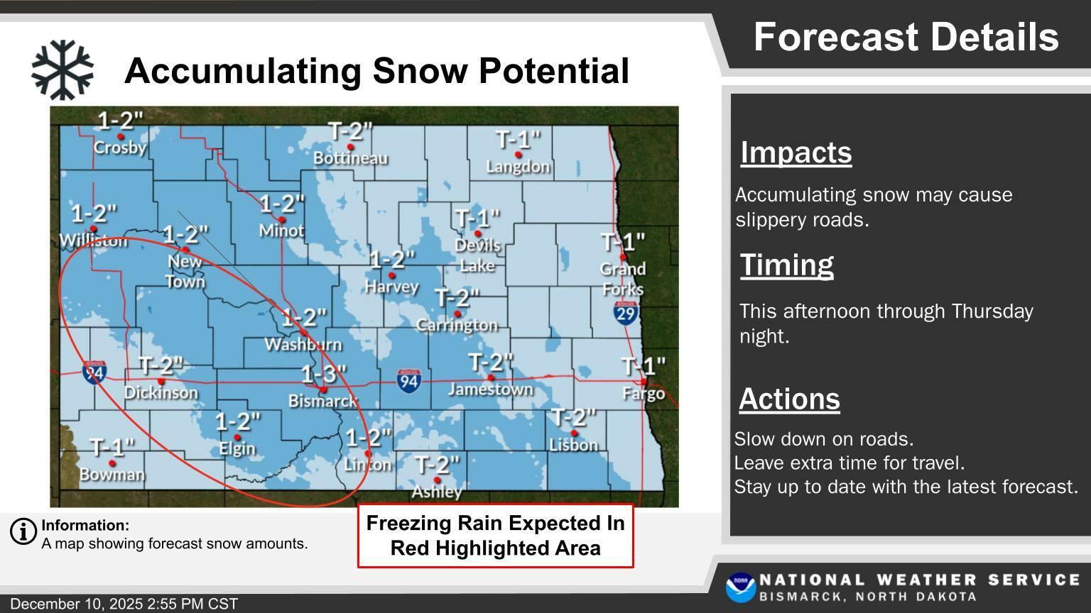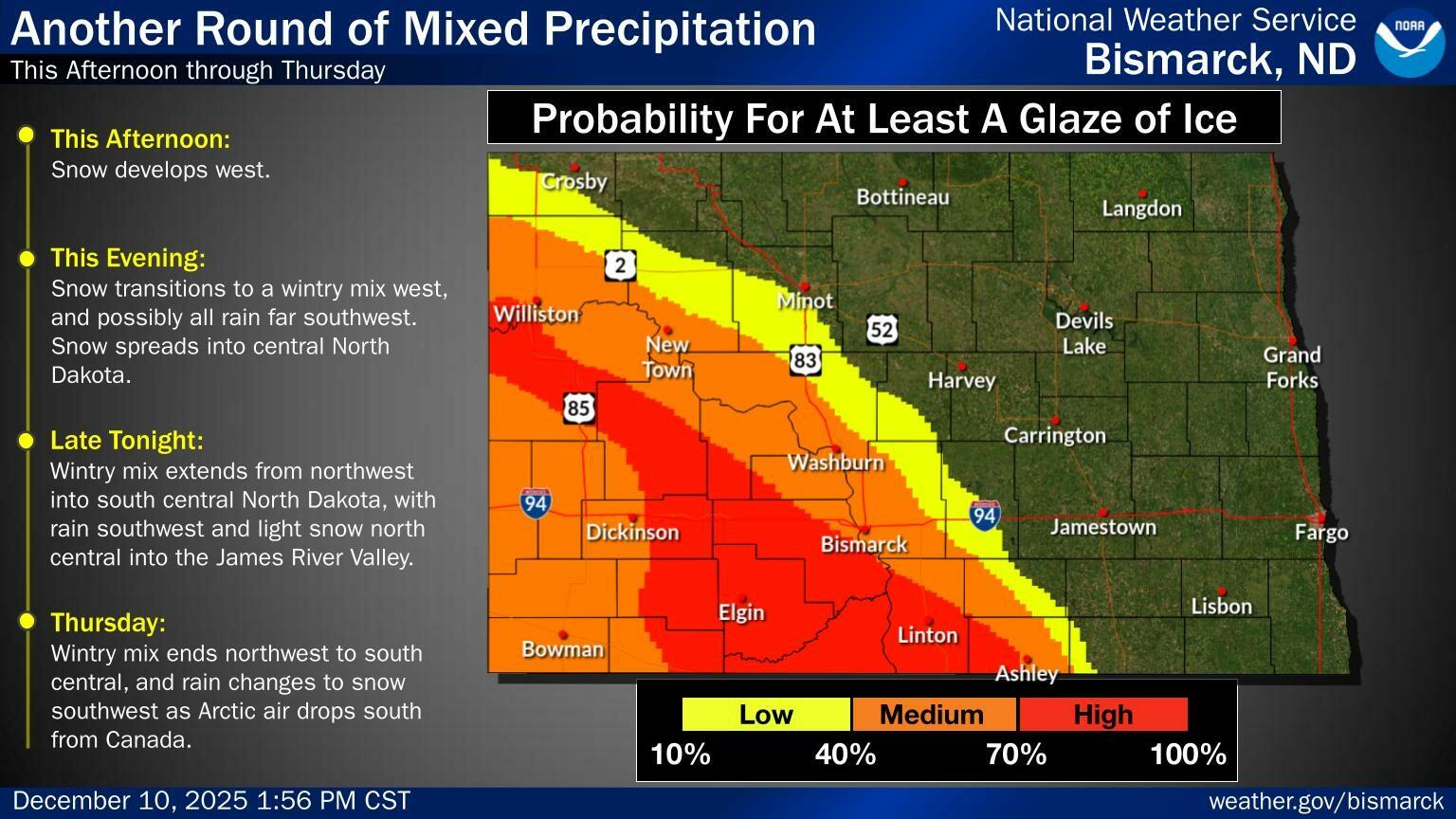 This afternoon through Thursday night, we are expecting a broad 1 to 2 inches of new snow accumulation across the area, with a low probability of exceeding 3 inches of snow. This snow will be moving into western North Dakota this afternoon, with a transition to a wintry mix tonight, before back to snow through the day Thursday.